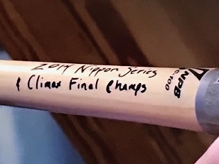 マートン これは日本シリーズの時のバットでチームメイト全員のサインが書いてあるのです。ノウミサン。これがゴメス、そしてアライサン。