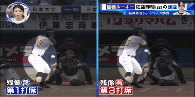 新井 この状態からスイングしにいくんで、左バッターだと右の股関節が壁になって見送れるんですよね。だけど1打席目に詰まらされたんで、3打席目になると「詰まりたくない」「また最後にインサイドに来るんじゃないか」というのが無意識のうちに頭に入ってて、胸のマークが見えるのが早くなるんです。