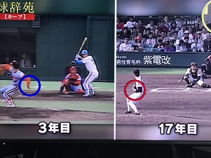星野 入団した時は真っ直ぐとカーブしかなかったので、当時はテイクバックがスゴく大きかったので、握りが見えてしまう。カーブだと白い部分が広くてテイクバックの瞬間に球種が読まれやすかった。そこでバッターに球種が分からないようにテイクバックをなるべく体の中でやるようになって、何年かやって段々とテイクバックが小さくなりましたね。